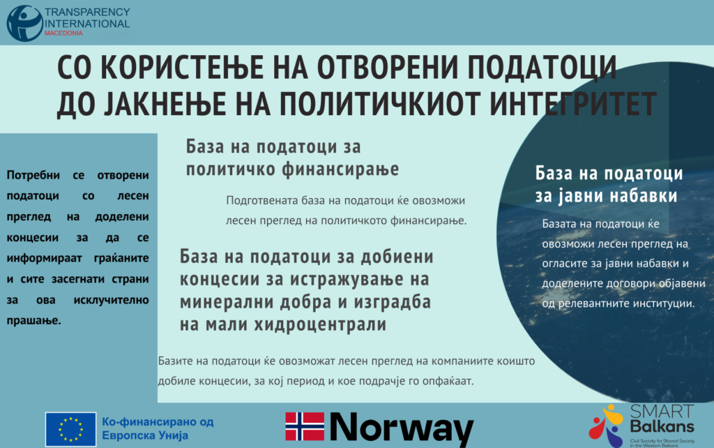Во ера на дигитализација достапноста од отворени податоци е од исклучителна важност и за борбата против корупцијата. Транспаренси Интернешнл- Македонија во рамките на проектот: „Следење на интегритетот во Западен Балкан и Турција: граѓански организации во борбата против корупцијата со податоци за политичкиот интегритет“ ќе подготви три бази на податоци и тоа за: политичко финансирање, база на податоци за јавни набавки и база на податоци за добиени концесии за истражување на минерални добра и изградба на мали хидроцентрали.