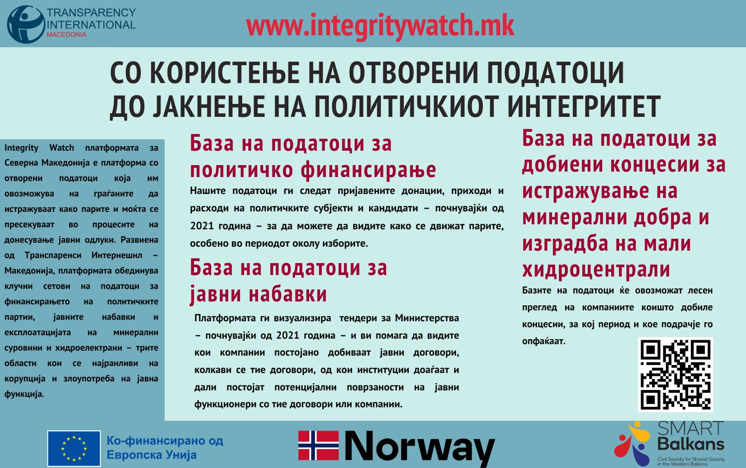 Integrity Watch платформата за Северна Македонија е платформа со отворени податоци која им овозможува на граѓаните да истражуваат како парите и моќта се пресекуваат во процесите на донесување јавни одлуки. Развиена од Транспаренси Интернешнл – Македонија, платформата обединува клучни сетови на податоци за финансирањето на политичките партии, јавните набавки и експлоатацијата на минерални суровини и хидроелектрани – трите области кои се најранливи на корупција и злоупотреба на јавна функција.