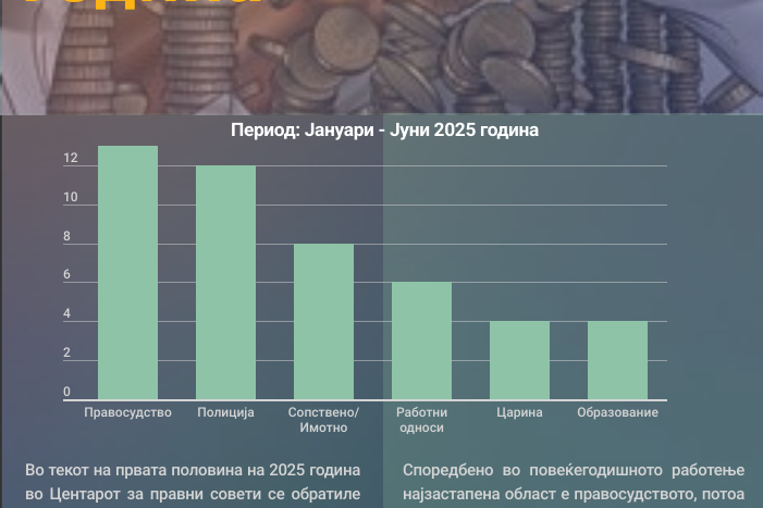 Центарот за правни совети работи во рамките на Transparency International – Macedonia и постои од 2003 година. Во текот на првата половина на 2025 година во Центарот за правни совети се обратиле 74 граѓани. Начин на кој граѓаните пристапиле до ценатарот најчесто е преку онлајн платформите на организацијата, телефонски и многу често граѓаните доаѓаат лично…