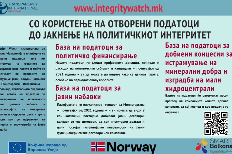 Integrity Watch платформата за Северна Македонија е платформа со отворени податоци која им овозможува на граѓаните да истражуваат како парите и моќта се пресекуваат во процесите на донесување јавни одлуки. Развиена од Транспаренси Интернешнл – Македонија, платформата обединува клучни сетови на податоци за финансирањето на политичките партии, јавните набавки и експлоатацијата на минерални суровини и…