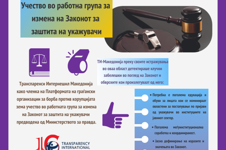 Претставник на ТИ- Македонија, како дел од Платформата на граѓанскио организации во борбата против корупцијата беше дел од првиот состанок на работната група за подготовка на Предлог на закон за заштита на укажувачи, кој се одржа на 10 мај 2023 во хотел Хилтон.