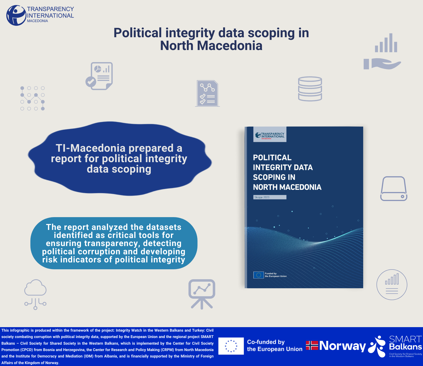 The report is prepared in the framework of the project: “Integrity Watch in the Western Balkans and Turkey: Civil society combating corruption with political integrity data”. This report builds on the assessment of nine datasets, conducted by TI-Macedonia, including: lobbying meetings, assets and interests of public officials, directories of public officials, government budget and spending, public procurement, political financing, voting records, and awarded concessions for exploration of mineral goods. These datasets were identified as critical tools for ensuring transparency, detecting political corruption and developing risk indicators of political integrity.