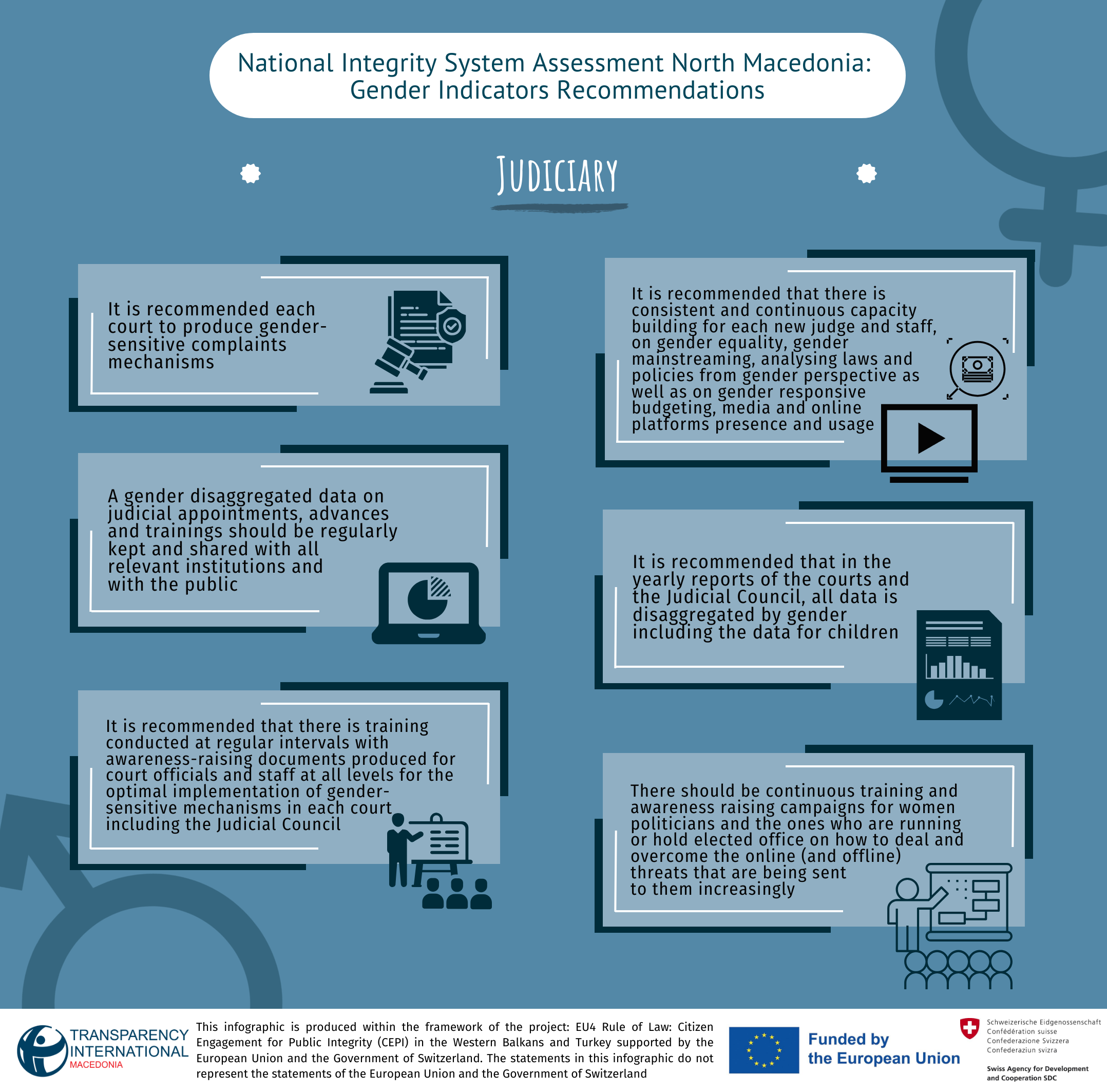 Within this Report, for the first time, there is a gender sensitivity analysis with recommendations conducted for the 14 pillars which are very relevant for the country’s integrity system. The analysis was conducted according to a methodology prepared by Transparency International. Gender sensitivity was one of the indicators to analyze the work of the 14 out of 15 pillars on which overall assessment was conducted.