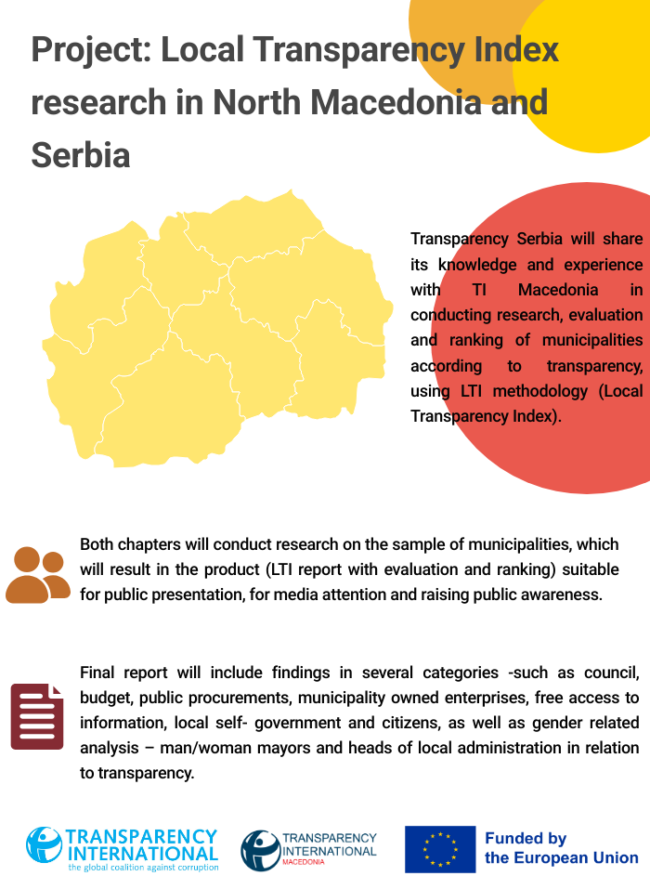 Project: Local Transparency Index research in North Macedonia and Serbia Period of implementation : june 2025 – january 2026 Donator: European Union Transparency Serbia will share its knowledge and experience with TI Macedonia in conducting research, evaluation and ranking of municipalities according to transparency, using LTI methodology (Local Transparency Index). Both chapters will conduct…