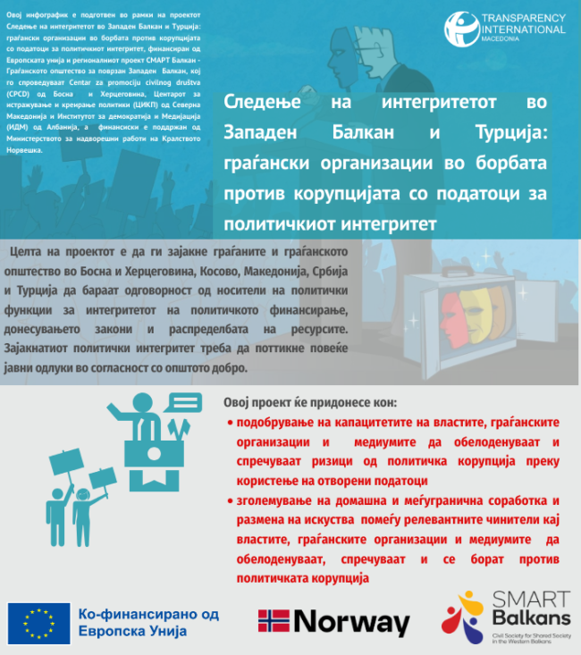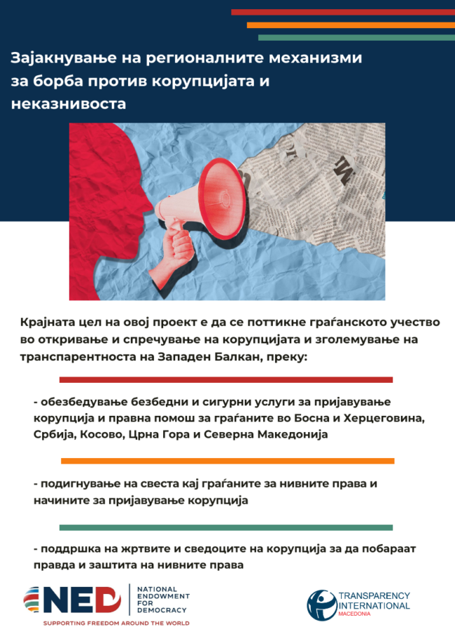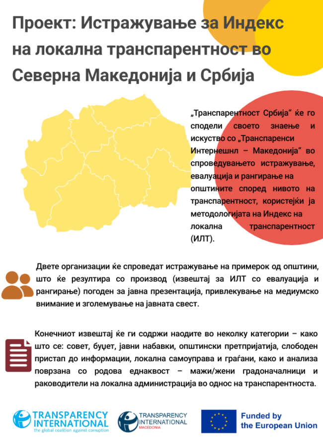 Проект: Истражување за Индекс на локална транспарентност во Северна Македонија и Србија Период на имплементација: јуни 2025 – јануари 2026 Донатор: Европска Унија „Транспарентност Србија“ ќе го сподели своето знаење и искуство со „Транспаренси Интернешнл – Македонија“ во спроведувањето истражување, евалуација и рангирање на општините според нивото на транспарентност, користејќи ја методологијата на Индекс…